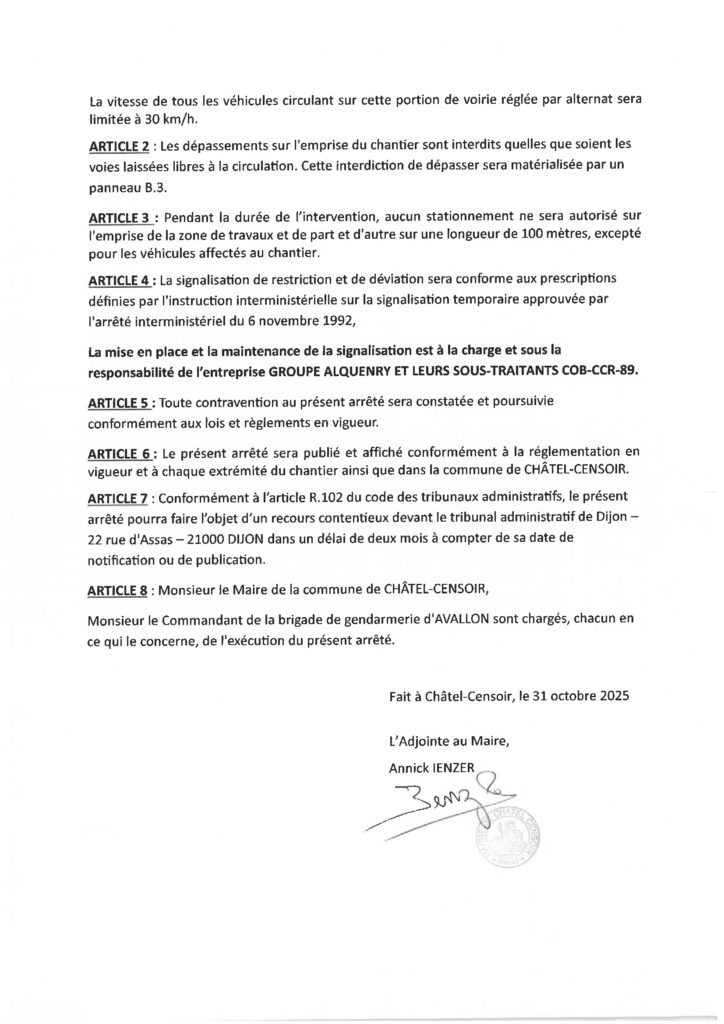 Du 03 au 28 novembre, sur les D130 et D100 Sur les communes de Merry sur Yonne et Châtel-Censoir, hors agglomération