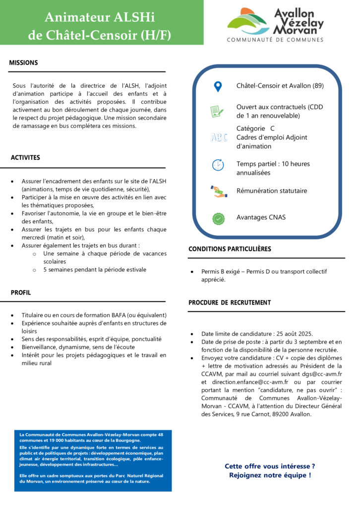 Offre d’emploi CCAVM Animation Châtel-CensoirPar Olivier Maguet / 14 septembre 2025 Le poste n’ayant pas été pourvu, l’annonce est toujours valide