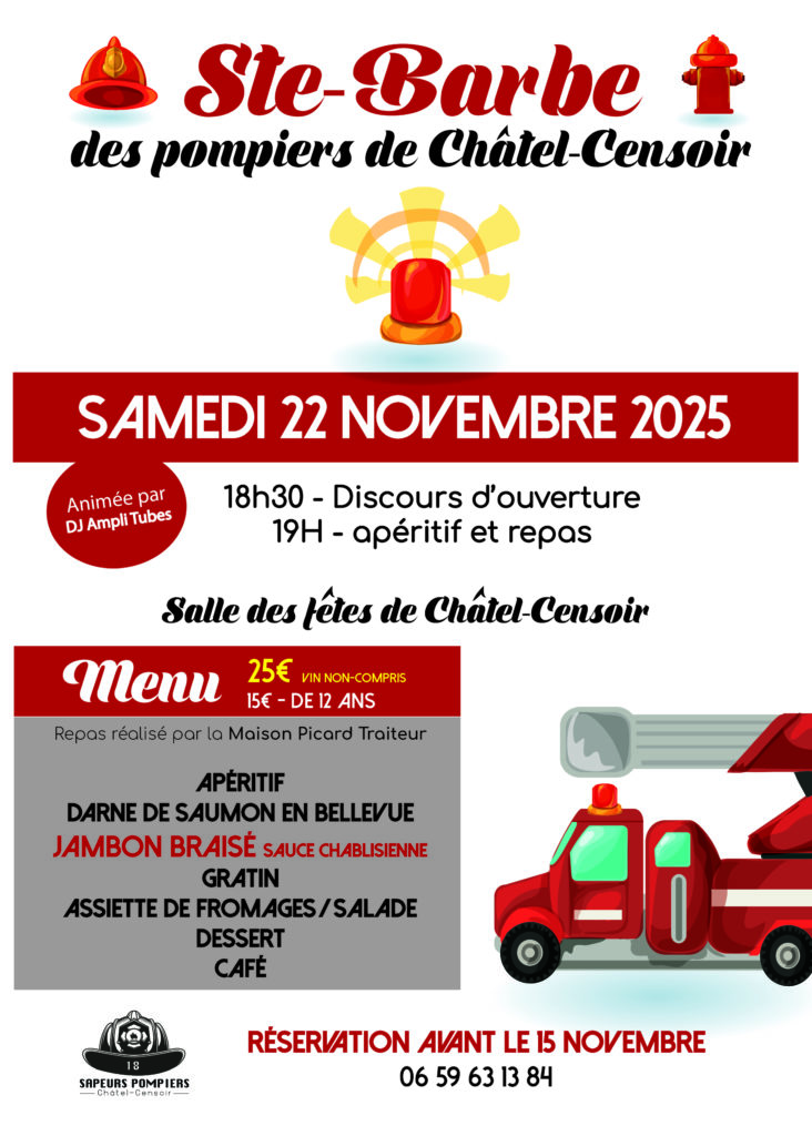 Sainte Barbe, repas des pompiers Samedi 22 novembrePar Olivier Maguet / 1 novembre 2025 A partir de 18 h 30 à la salle polyvalente de Châtel-Censoir